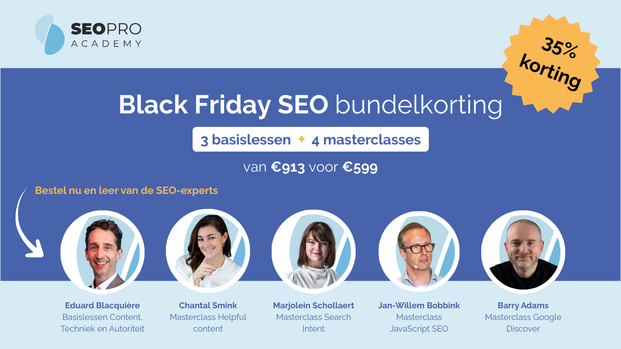 Bespaar 25% en bestel de masterclasses Google Discover, Helpful Content en JavaScript SEO (€199 per stuk) samen in een bundel. In plaats van €597 betaal je slechts €449.