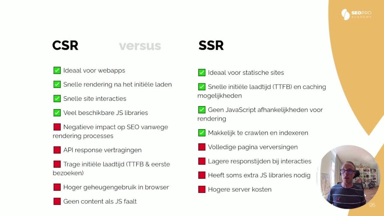 Van Client Side Rendering (CSR) tot het SEO-vriendelijkere Server Side Rendering (SSR): in hoofdstuk 6 leer je welke aanpak het beste werkt om je JavaScript-site beter vindbaar te maken.