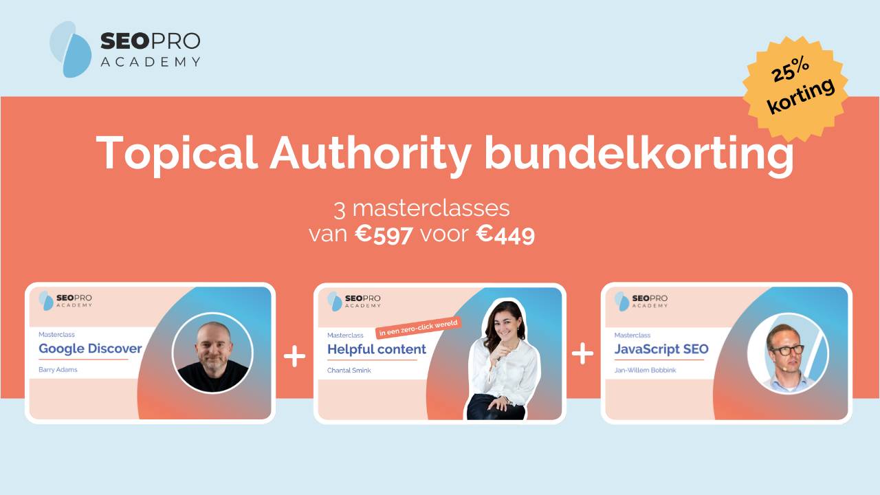 Bespaar 25% en bestel de masterclasses Google Discover, Helpful Content en JavaScript SEO in een bundel (€199 per stuk). In plaats van €597 betaal je slechts €449.